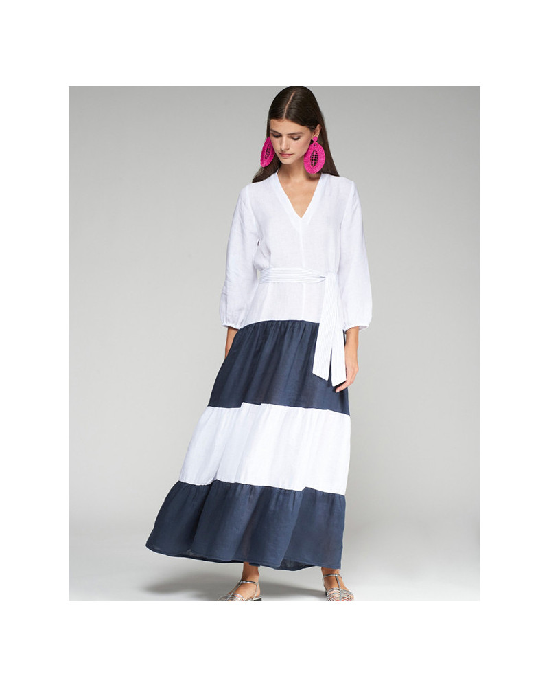 Vestido largo confeccionado en lino, con franjas verticales azules y blancas.