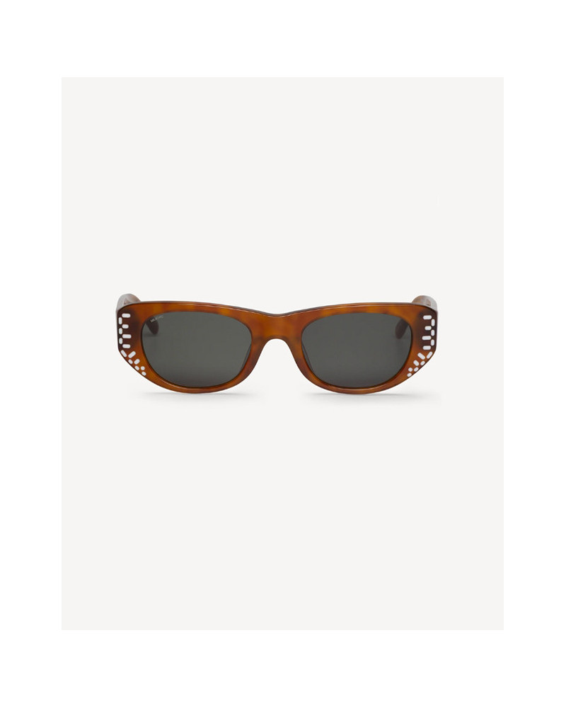 Gafas de sol con forma agresiva y rotunda donde prima la horizontalidad y la particularidad.