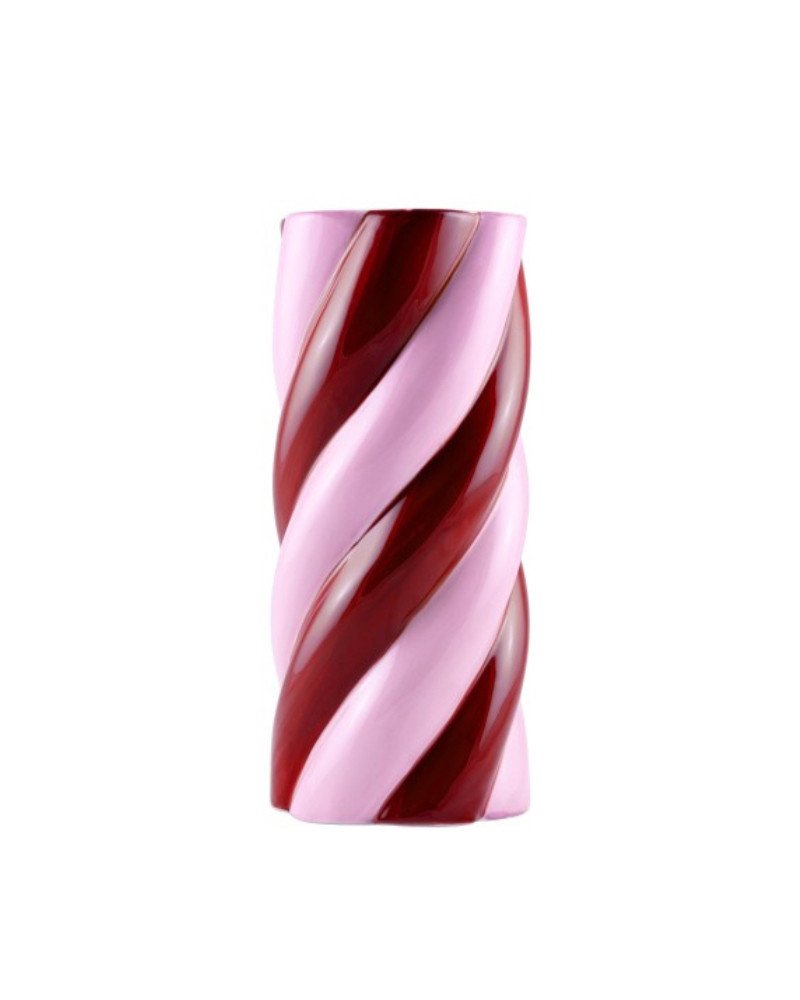 Jarrón de cerámica pintado a mano con detalle en espiral rosa y rojo