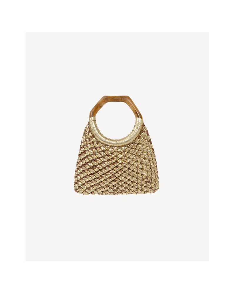Bolso de mano hecho con nudos de piel ovina y asa geométrica de resina.