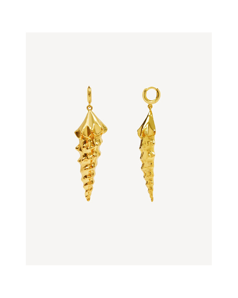 Pendiente dorado formado por una caracola larga.