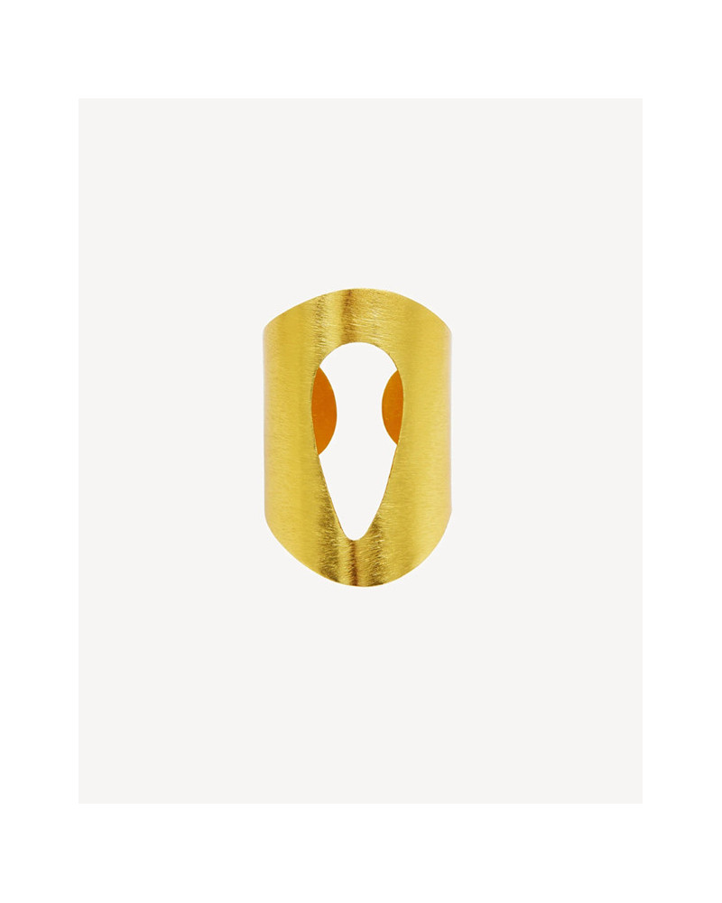 Pulsera ancha y abierta, con una gota vacía, dorada con textura.