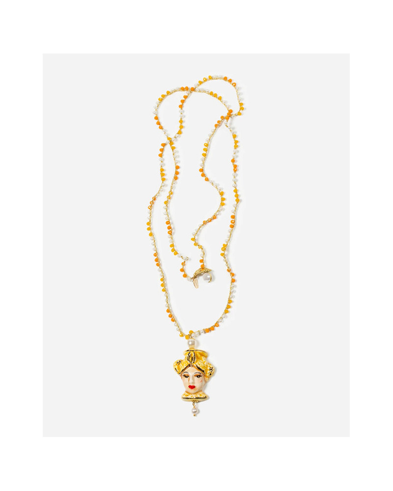 Piedra de circonita de colores y perlas. "Testa di Moro" hecho de cerámica siciliana de Caltagirone y perla natural.