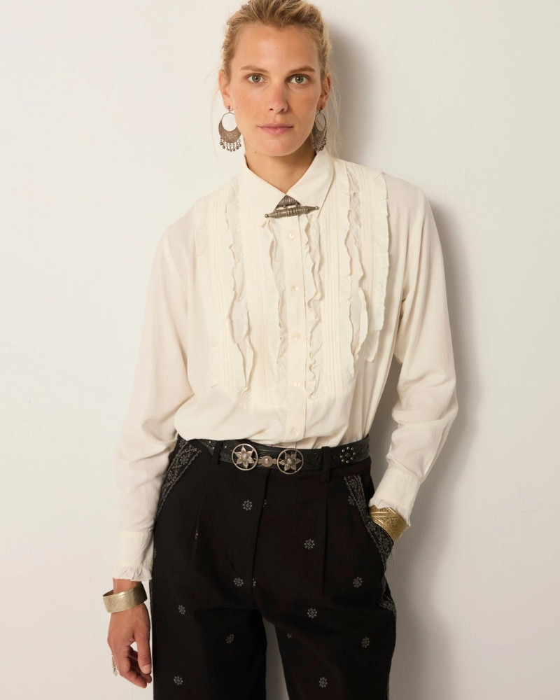 Blusa en rayón de algodón fresco y estructurado con un toque ligeramente masculino, suavizado por su ligera caída.