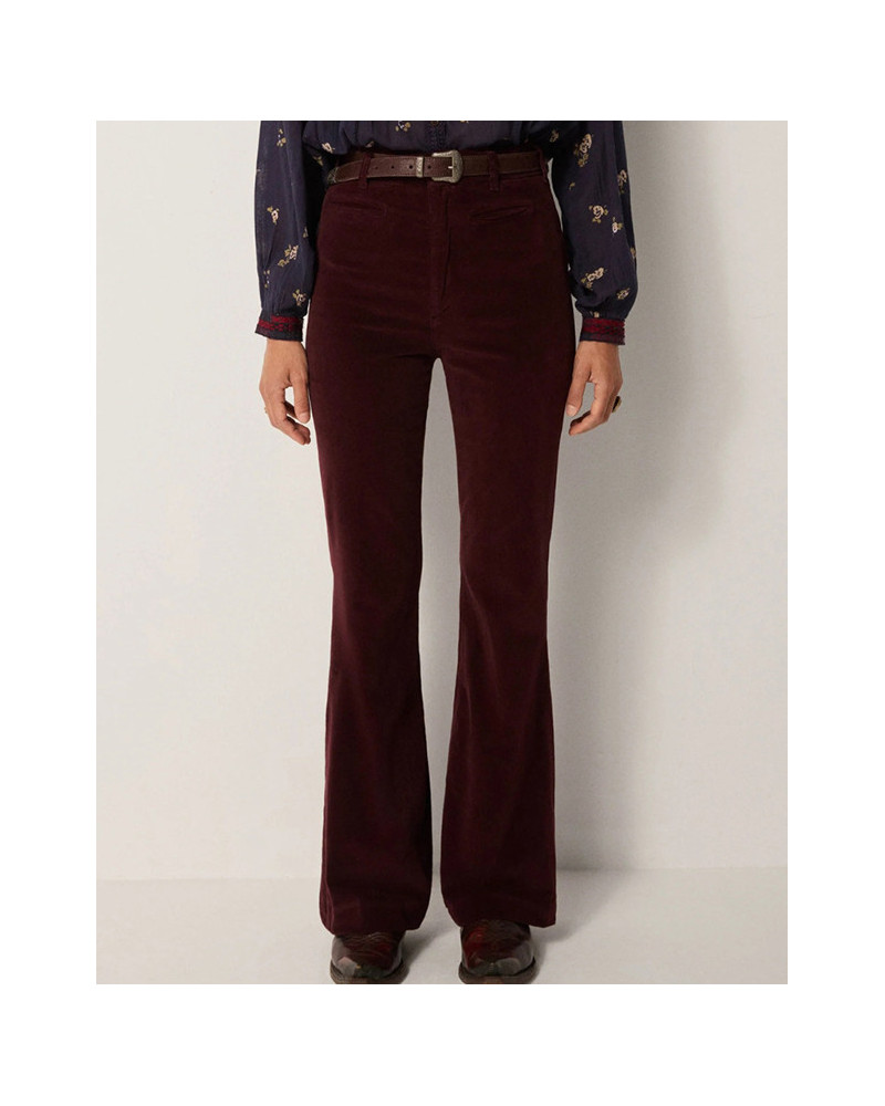 Una cintura alta favorecedora y una pernera acampanada definen el pantalón dándole una silueta segura y un atractivo atemporal.