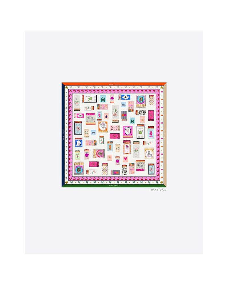 Estampado con cajas de cerillas ilustradas en múltiples colores y formatos.