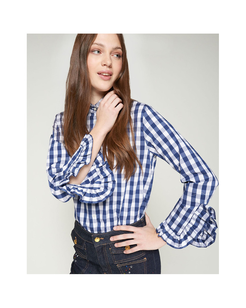 Camisa de cuadros vichy azul marino y blanco con cuello camisero clásico.