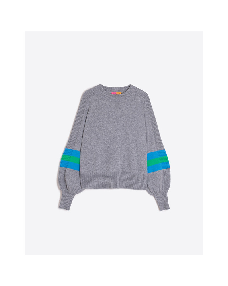 Las mangas globo están rematadas en puños canalé y decoradas con franjas horizontales en azul y verde.