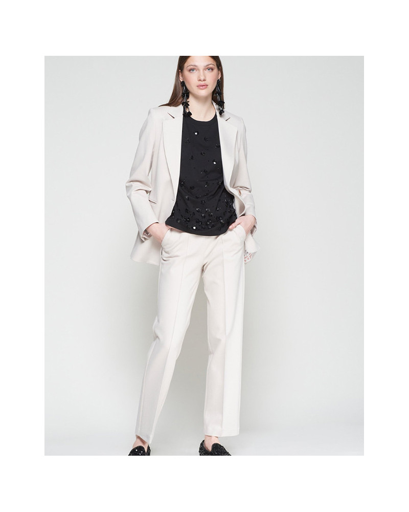 Pantalón crudo de corte recto con pinzas marcadas en el delantero.