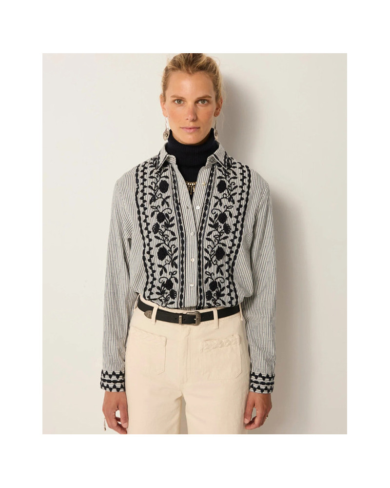 Un intrincado bordado floral negro recorre la tapeta y los puños, contrastando con las finas rayas para aportar estructura y encanto.