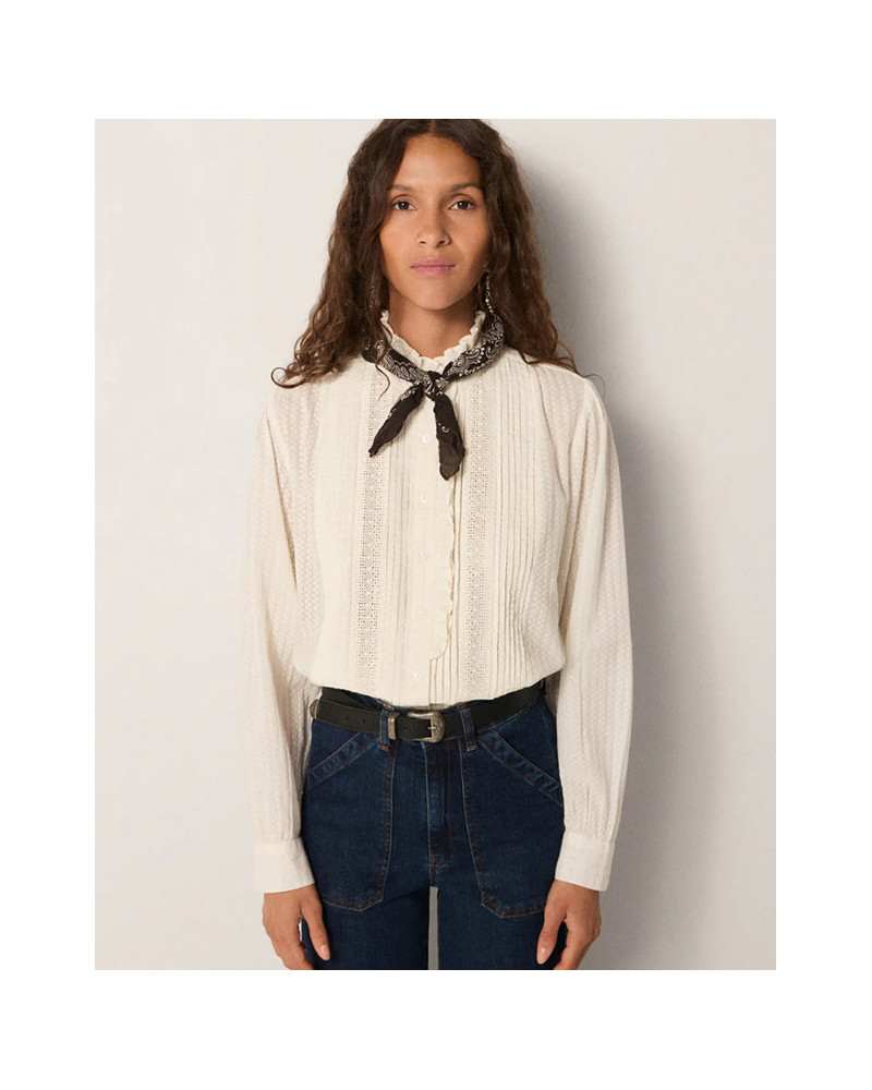 Blusa perla confeccionada en suave dobby de algodón con ribetes, aporta un sutil juego de texturas con delicados frunces y detalles de volantes en la parte delantera.