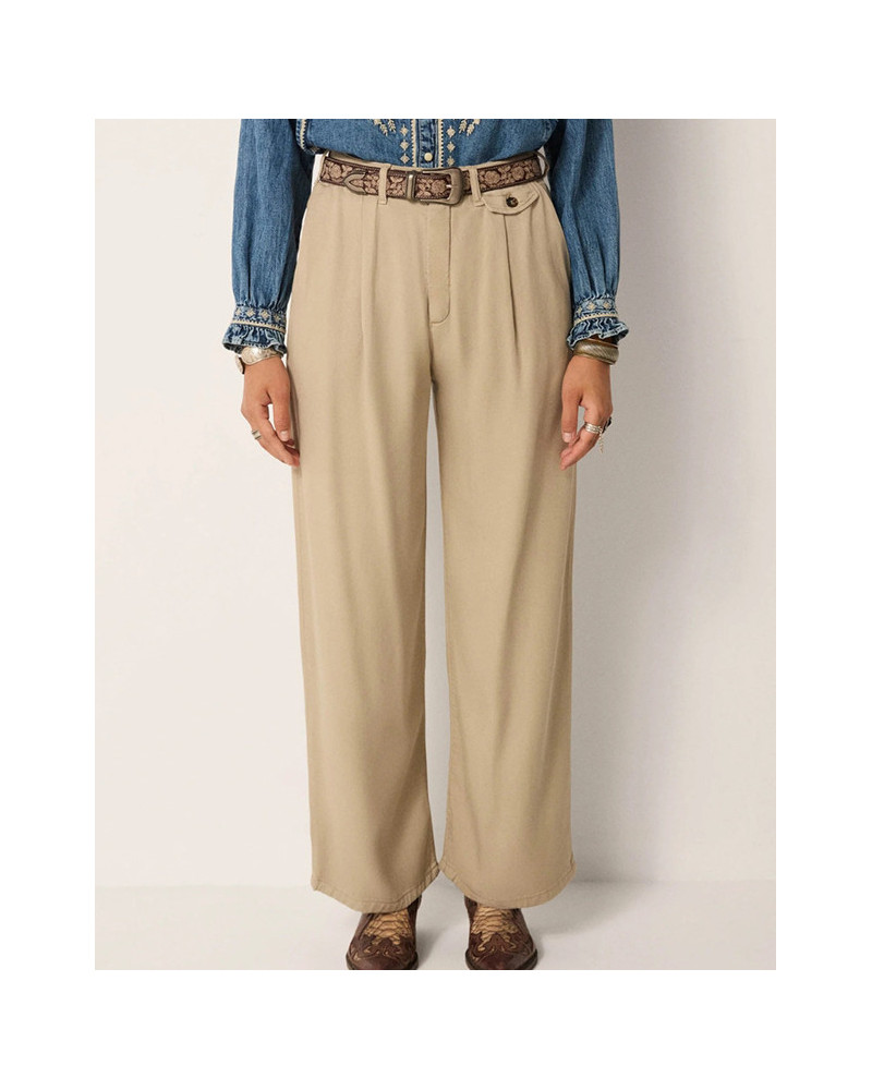 Pantalón con cintura alta, pliegues suaves y pernera ancha,que aportan estructura y un corte relajado.