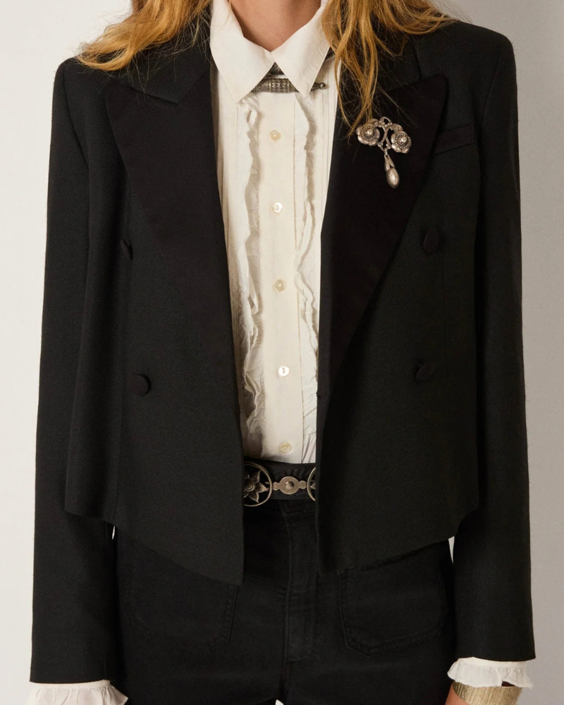 De doble botonadura, evoca la sastrería clásica masculina, mientras que su silueta corta la reinventa con un toque moderno y sofisticado.