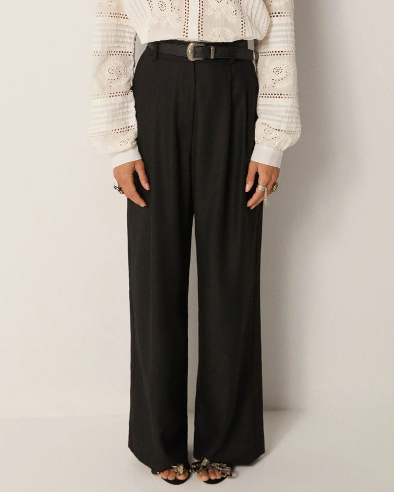 De talle alto, con cinturilla plana y sutiles pliegues que aportan movimiento sin volumen.