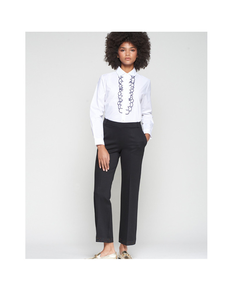 Pantalón recto en tejido de punto elástico negro, con costura central marcada y cintura lisa con trabillas.