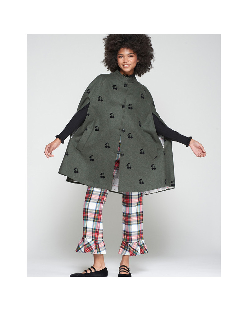 Capa confeccionada en tejido mezcla de lana con bordado de cerezas negras.