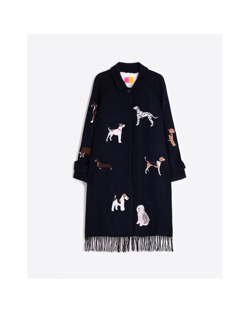 Lleva ilustraciones bordadas de perros en todo el frontal y mangas.