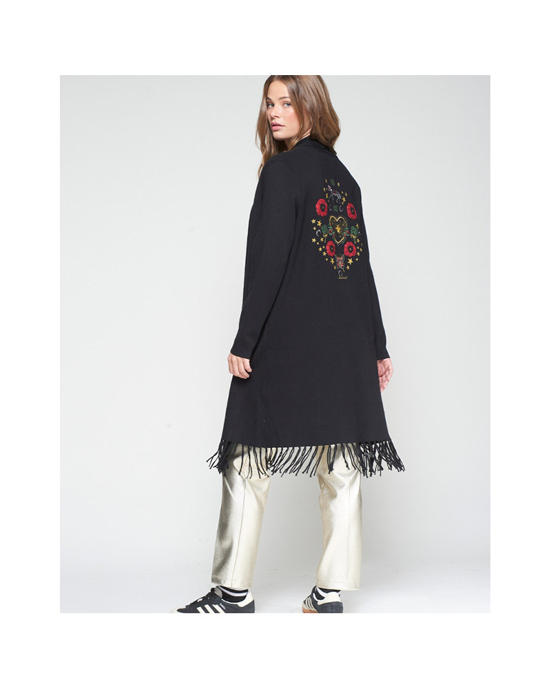 Bordado trasero con motivos hípicos: corazón central rodeado de estrellas, flores, mariposa y un caballo.