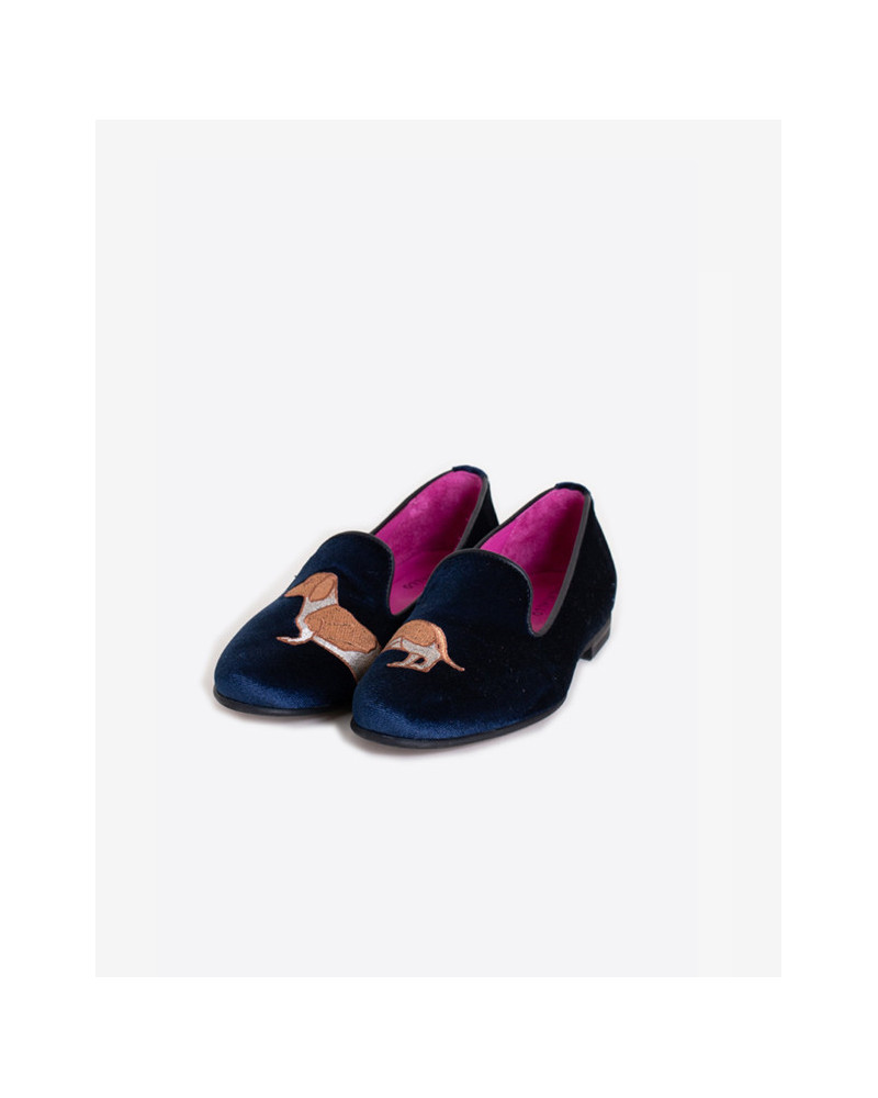 Slipper en terciopelo azul marino con bordado frontal de perro salchicha teckel.