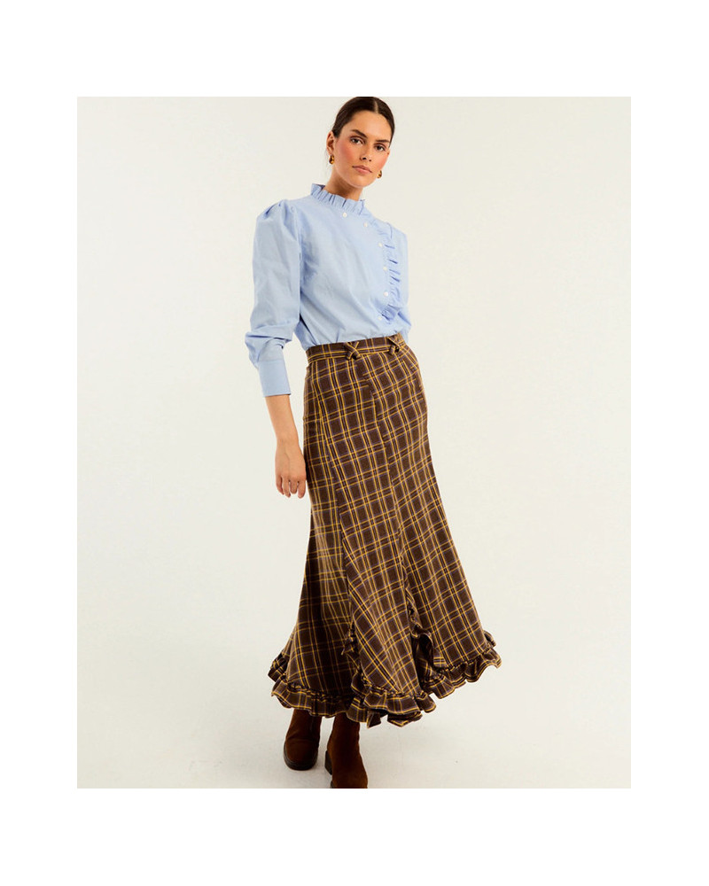 Acaba en unos volantes fruncidos que le dan mucho movimiento a la falda.