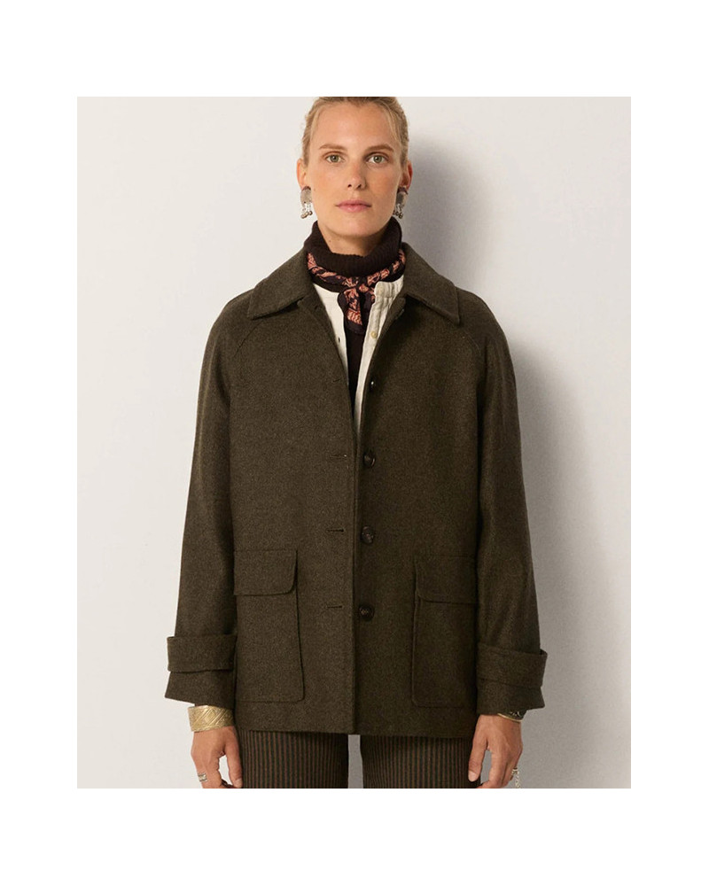 Su corte recto y cuello elegante lo hacen versátil, mientras que el intenso tono oliva le aporta sofisticación natural.