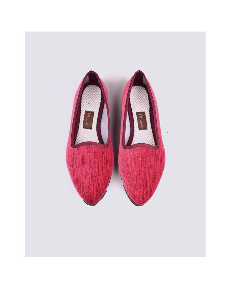 Slipper realizado en resistente terciopelo lavable de alta calidad color rosa intenso con trama marcada en tonos fucsia y burdeos y ribete al tono.