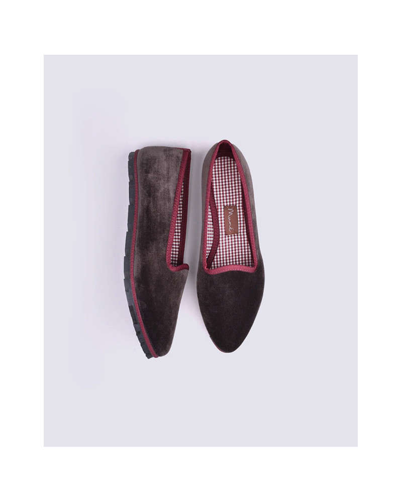 Slipper realizado en resistente terciopelo lavable de alta calidad color marrón chocolate y ribete burdeos.