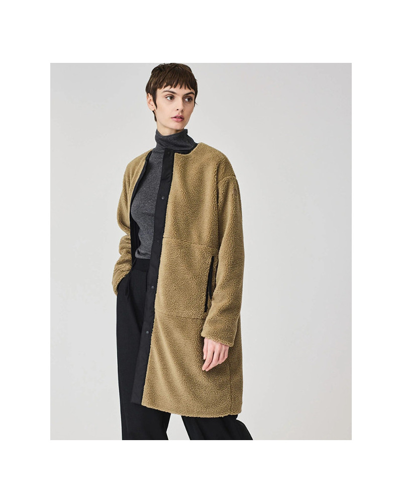Su silueta amplia hasta la rodilla incluye un cuello redondo y una tapeta frontal forrada con tejido 100 % nylon, que aporta un acabado suave y elegante.
