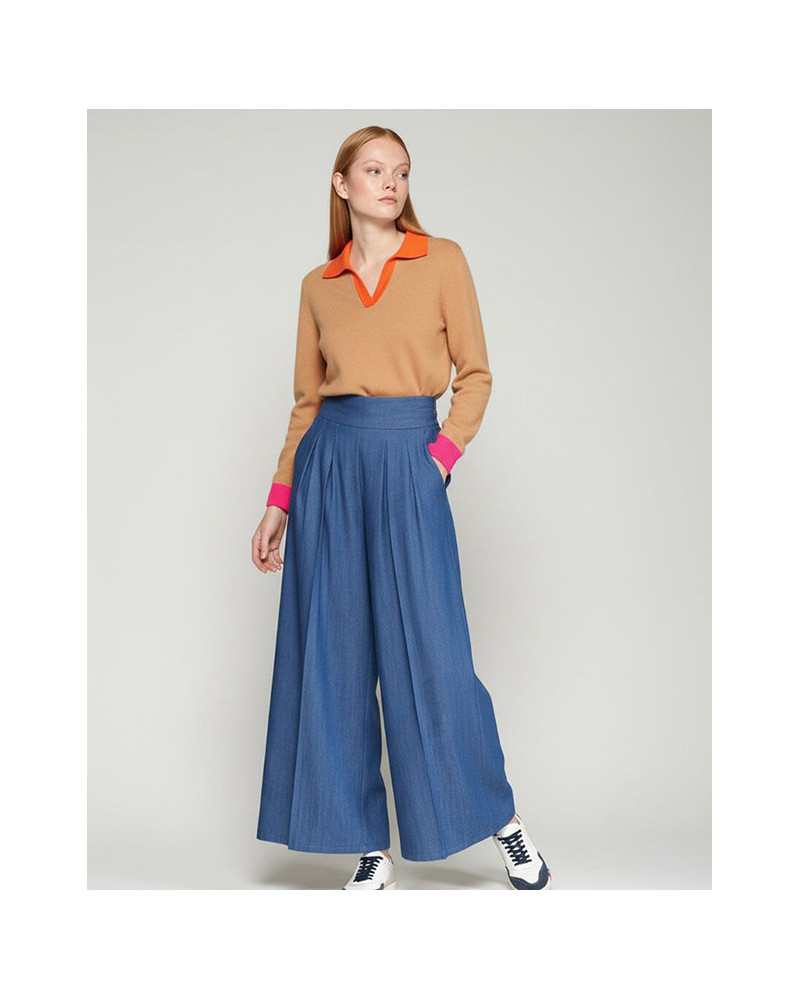 Jersey de punto color camel con cuello tipo polo en naranja intenso.