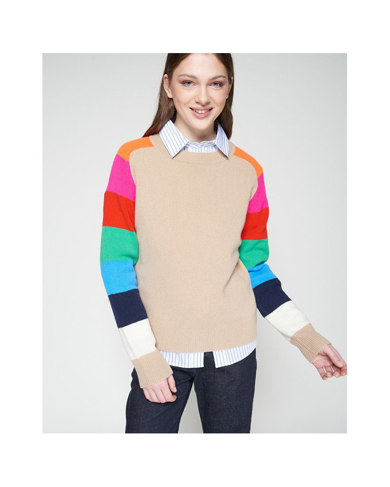 Jersey de fondo camel con mangas en bloques de color en rosa, rojo, verde, azul y crudo.
