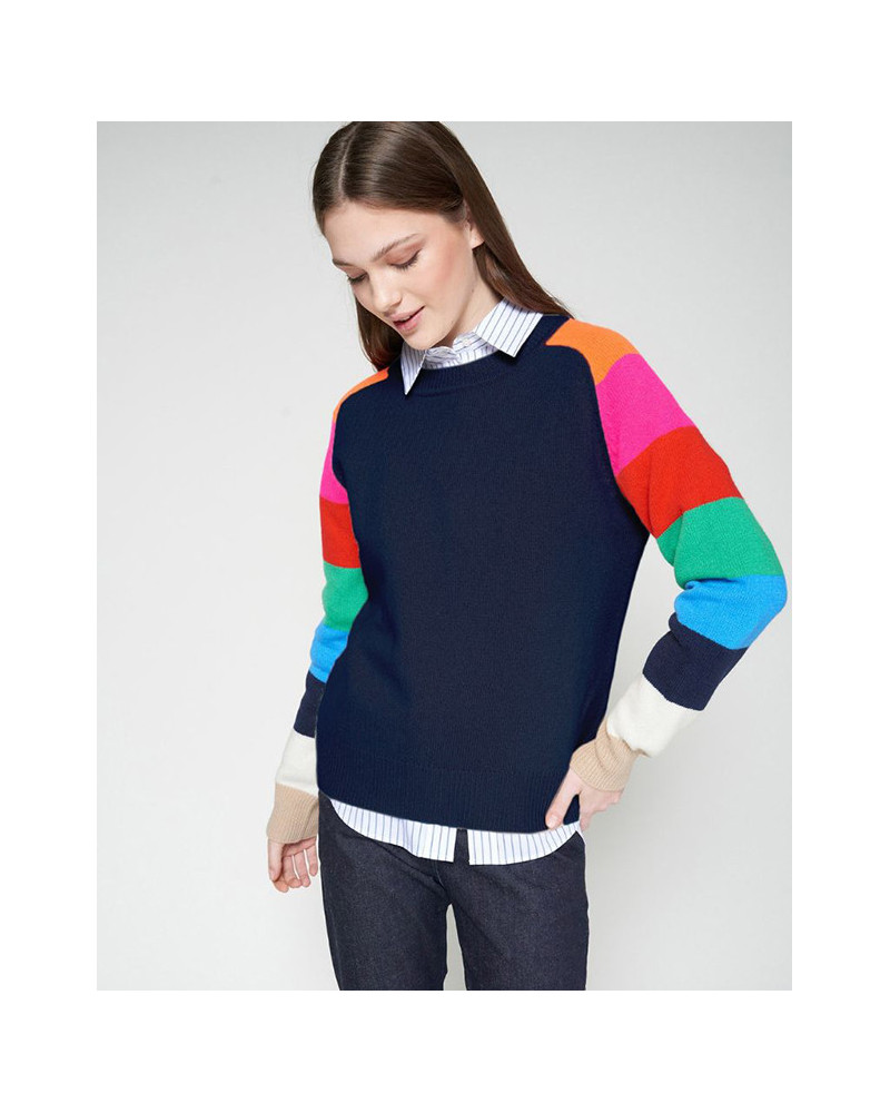 Jersey azul marino de corte recto confeccionado en 100% lana. L leva mangas en bloques de color vivos fucsia, rojo, verde, azul, marino y crudo con acabado acanalado. Cuello redondo y bajo recto. Tejido cálido y suave al tacto.