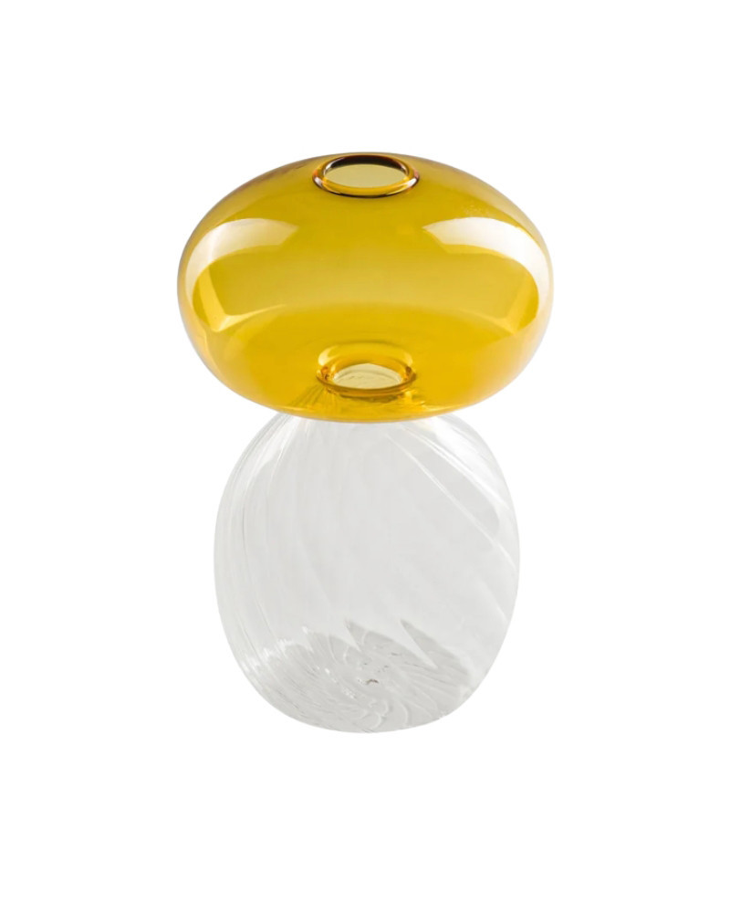 Jarrón de cristal con formas redondeadas en delicados tonos blanco y ámbar.