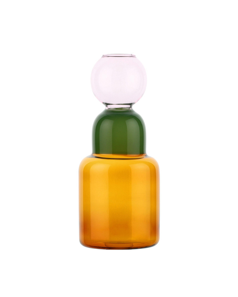 Jarrón de cristal con formas geométricas en vibrantes tonos lila, verde y ámbar.