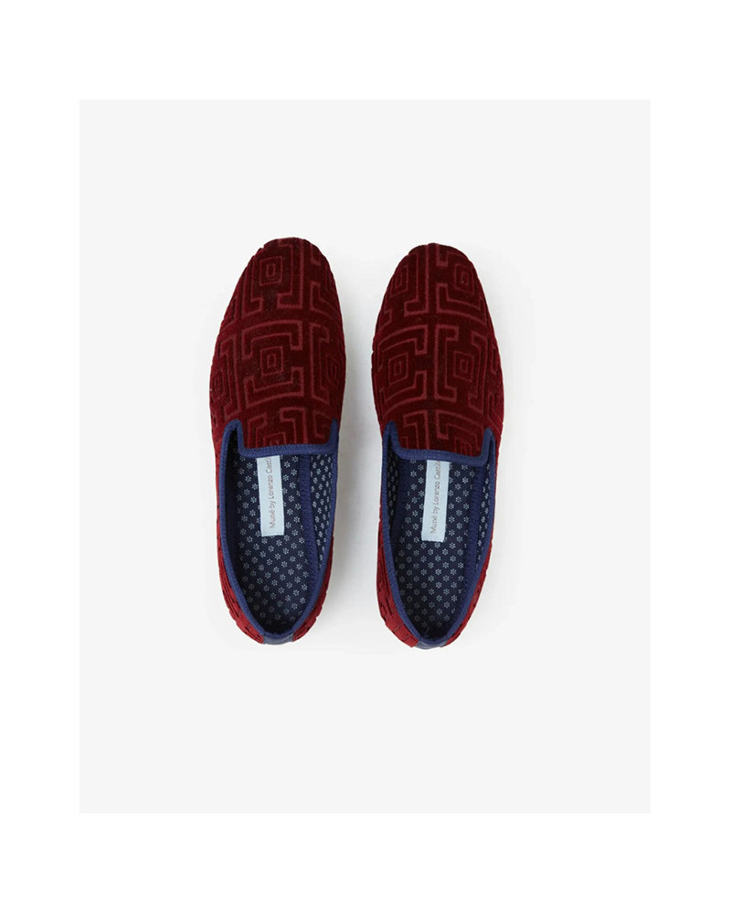 Slippers diseñados por el prestigioso anticuario y decorador Lorenzo Castillo, fabricados en España de forma sostenible con tejido terciopelo semiliso burdeos, haciendo trama geométrica, creado por él para la legendaria firma Gastón y Daniela, y ribete azul plomo.