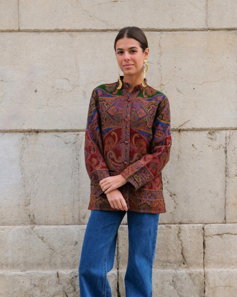 Chaqueta de lana merino, suave y cálida en tonos granate, azul y verde y estampado Paisley.
