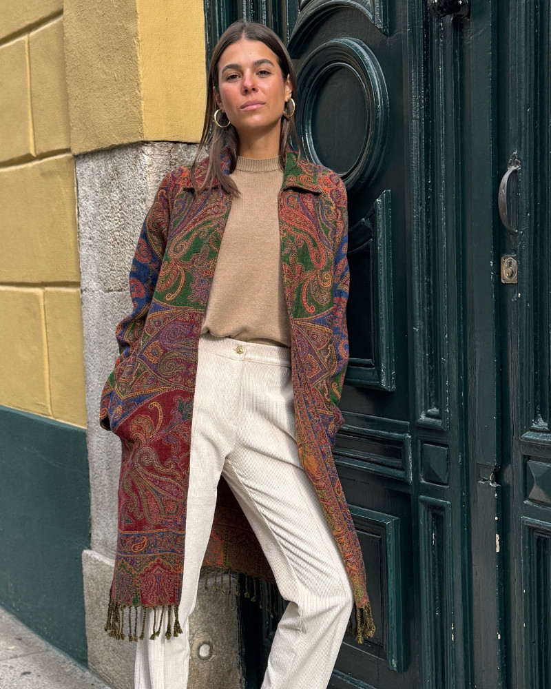 Abrigo largo de lana merino, suave y cálido, con flecos decorativos en el bajo y elegante estampado paisley.