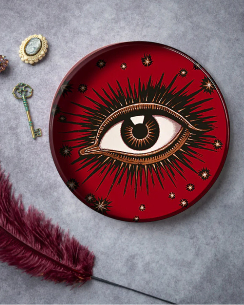 Bandeja redonda decorativa en color rojo con detalle de ojo.