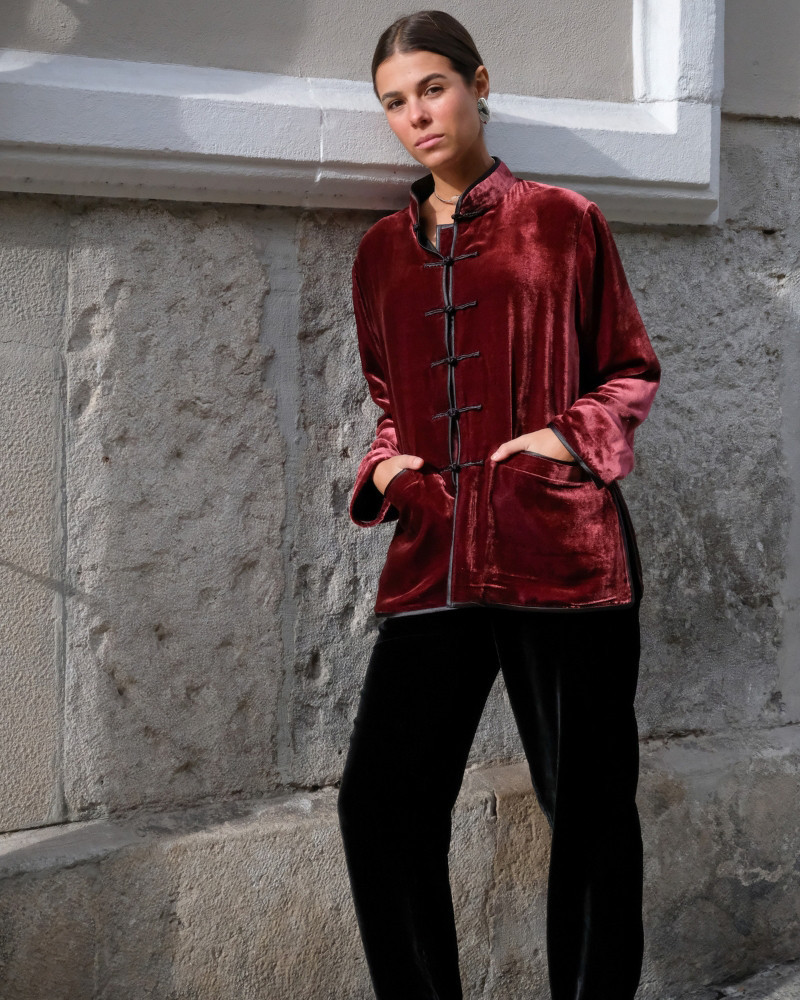 Chaqueta de terciopelo media, combinada con seda natural en color frambuesa.