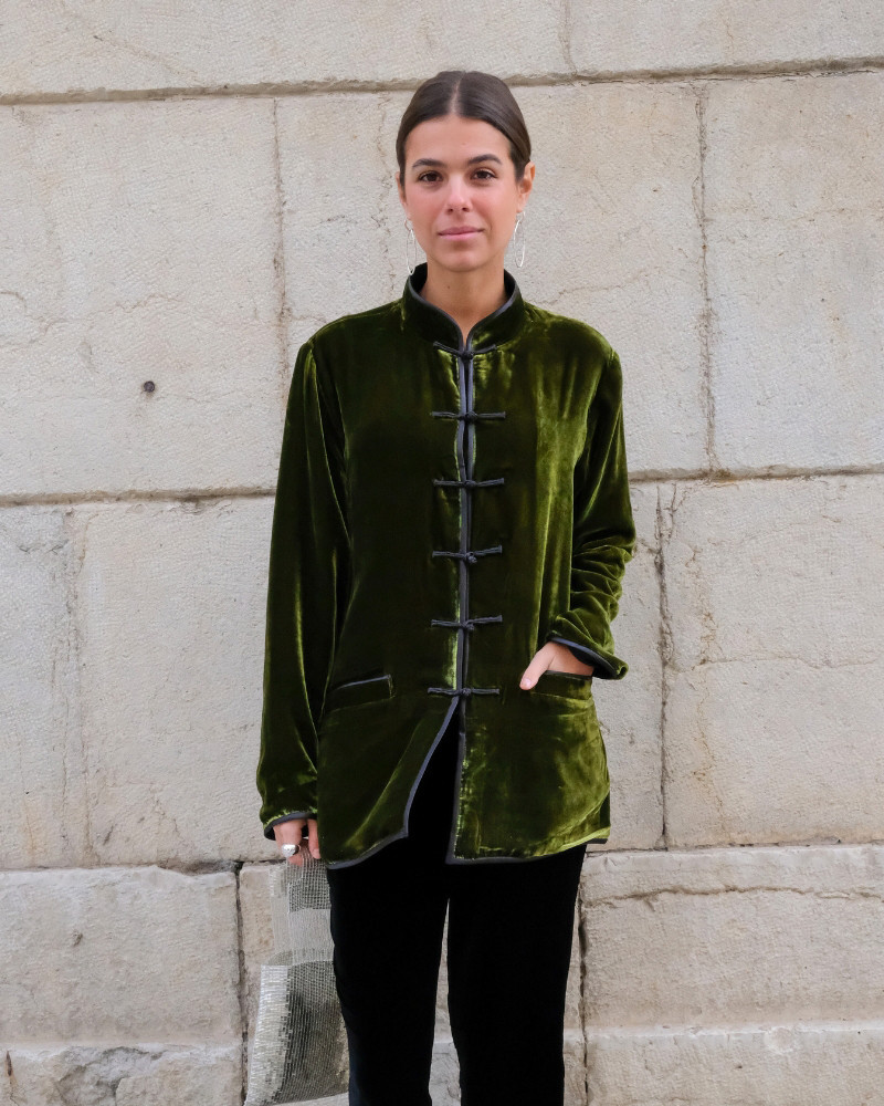 Chaqueta de terciopelo media, combinada con seda natural en color kaki.