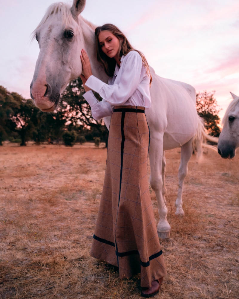 Falda larga evasé de lana merino 100% en color camel, con tiro alto, detalles de ondulina azul marino y cierre lateral invisible.