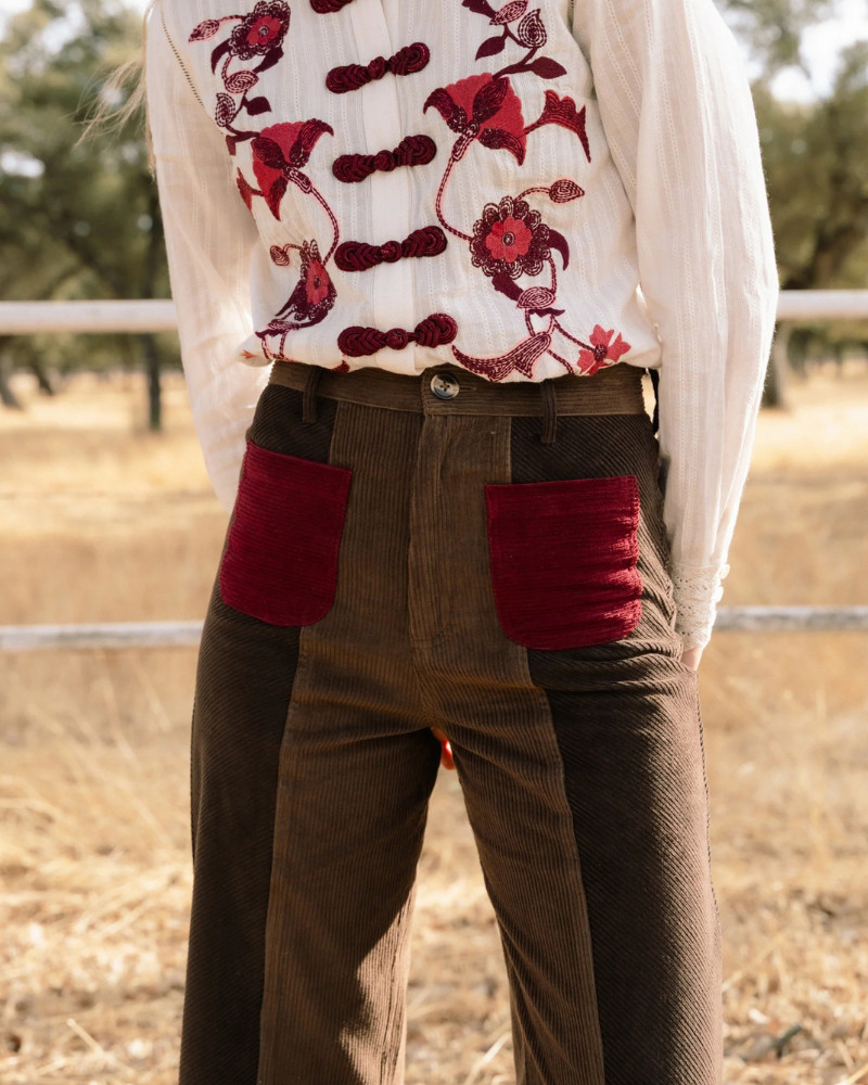 PANTALÓN PANA MARRÓN CONTRASTES GRANATES