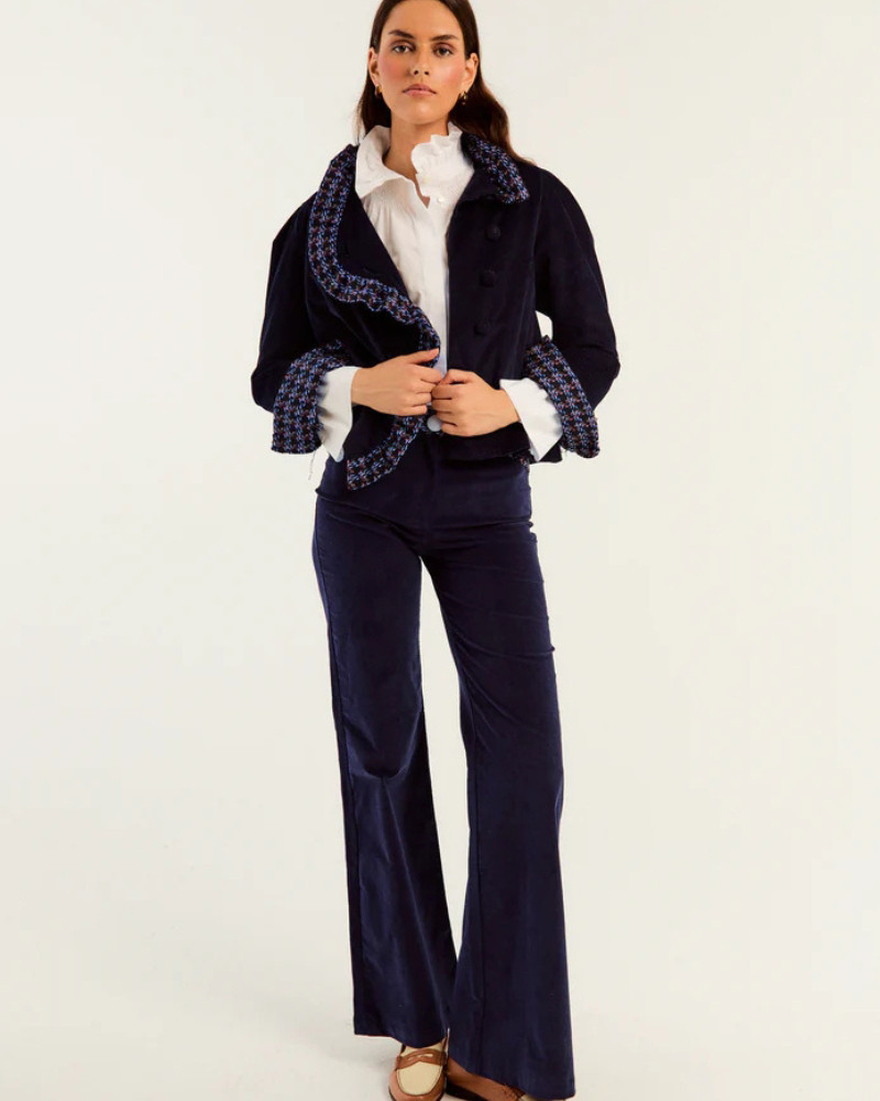 Pamtalón de pana azul con detalle estampado al tono en cinturilla.