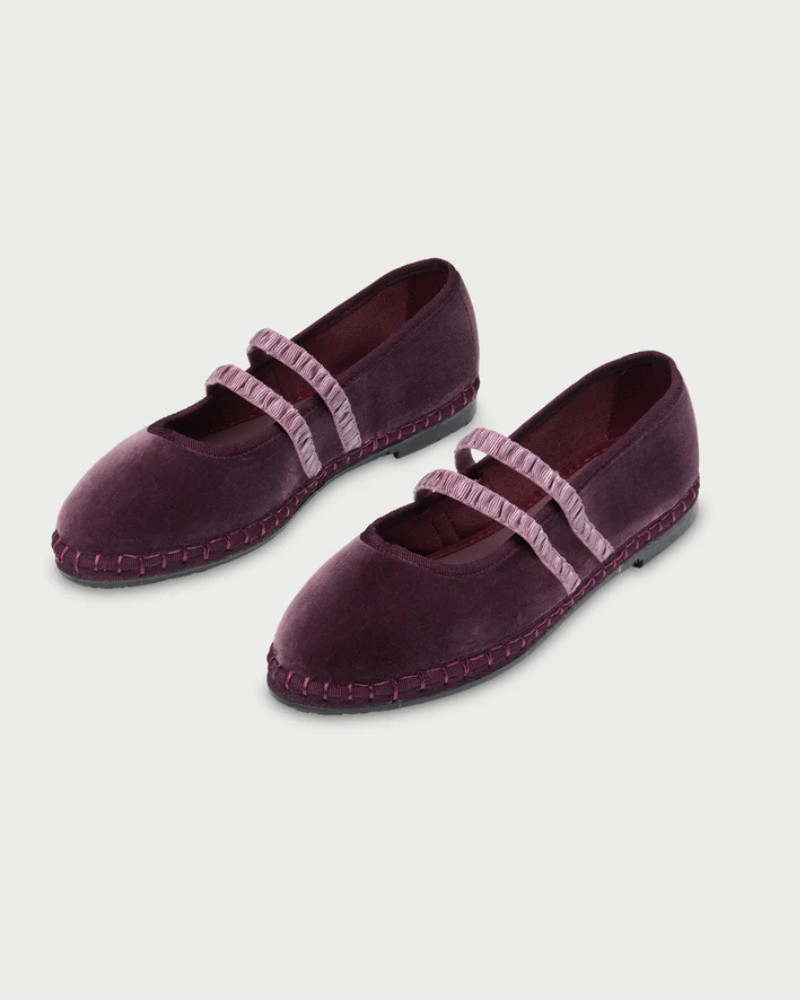 Mary Jane de terciopelo morado con ribete y dos bandas elásticas lila, exterior 100% terciopelo de algodón, interior 100% algodón orgánico antibacteriano y suela de caucho hecho de neumáticos de bicicleta reciclados.
