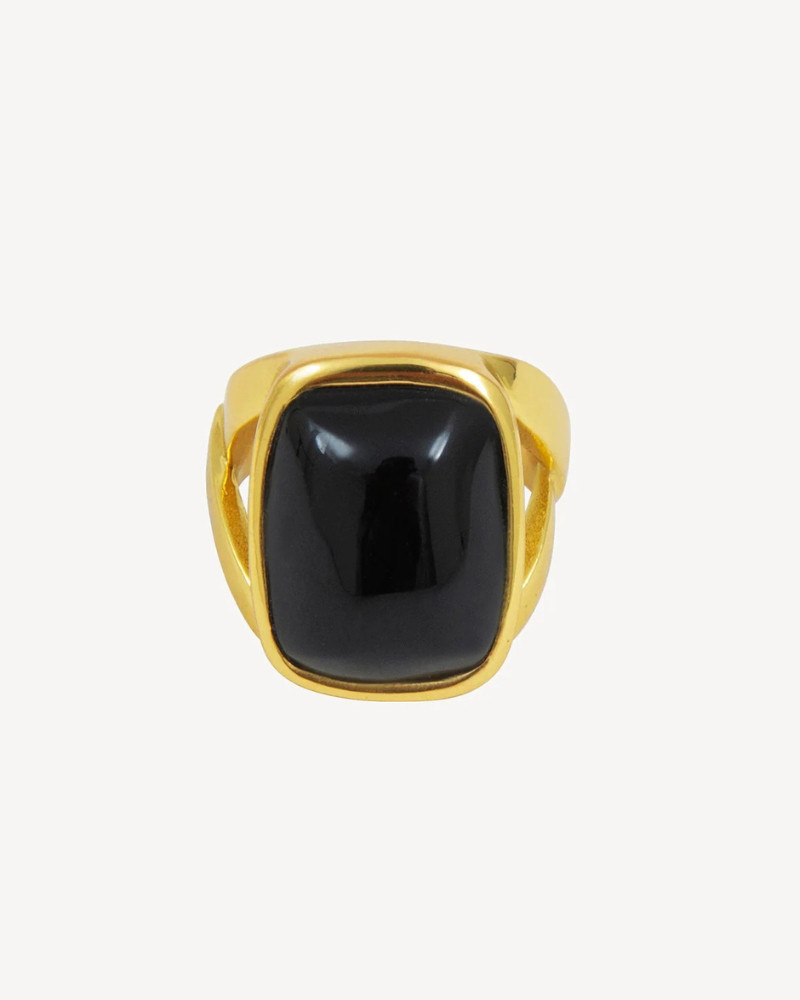 Anillo de resina rectangular negra sujetado por una base metálica triangular en oro. Una pieza única, diseñada en Barcelona.