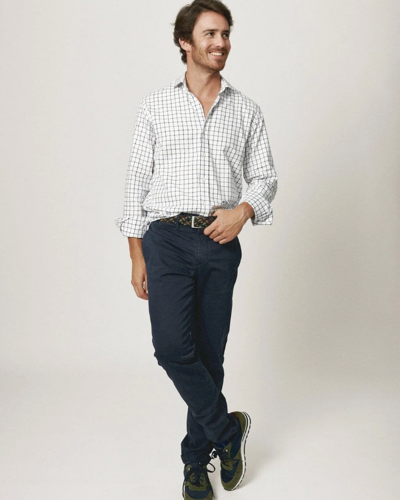 Camisa de sarga con cuello italiano y cuadros clásicos, teñida en los colores exclusivos de temporada.