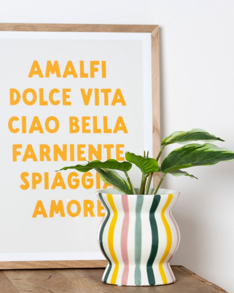 Macetero con silueta ondulada y rayas multicolor pintadas a mano.