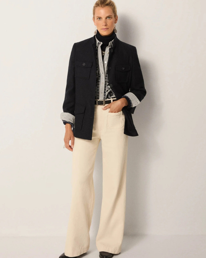 La chaqueta Lucien, inspirada en la sastrería del ejército marino, combina lana resistente, líneas limpias y un tono militar sofisticado.