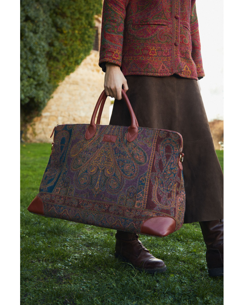 Bolso de viaje espacioso con elegante estampado paisley y detalles en cuero.