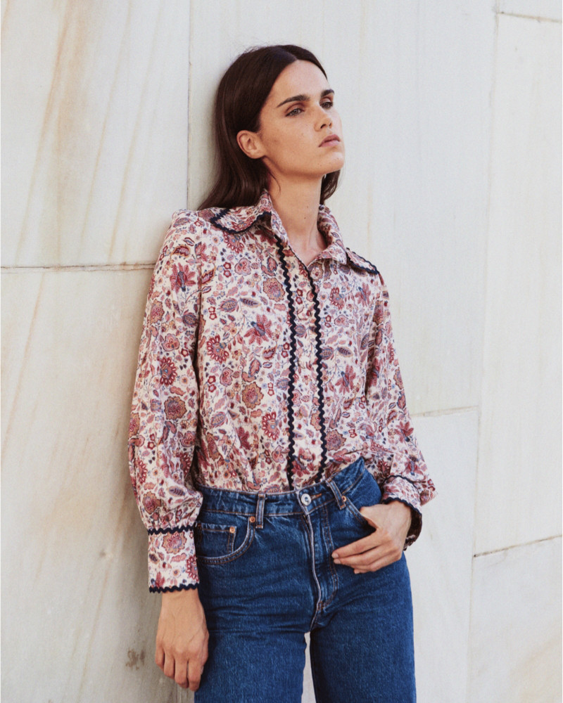 Confeccionada con un tejido estampado de flores en tonos tierra, rosas y azules, y caracterizada por el uso de ondulina de color azul marino, la camisa Carrie Elisabeth llama la atención por su singularidad.