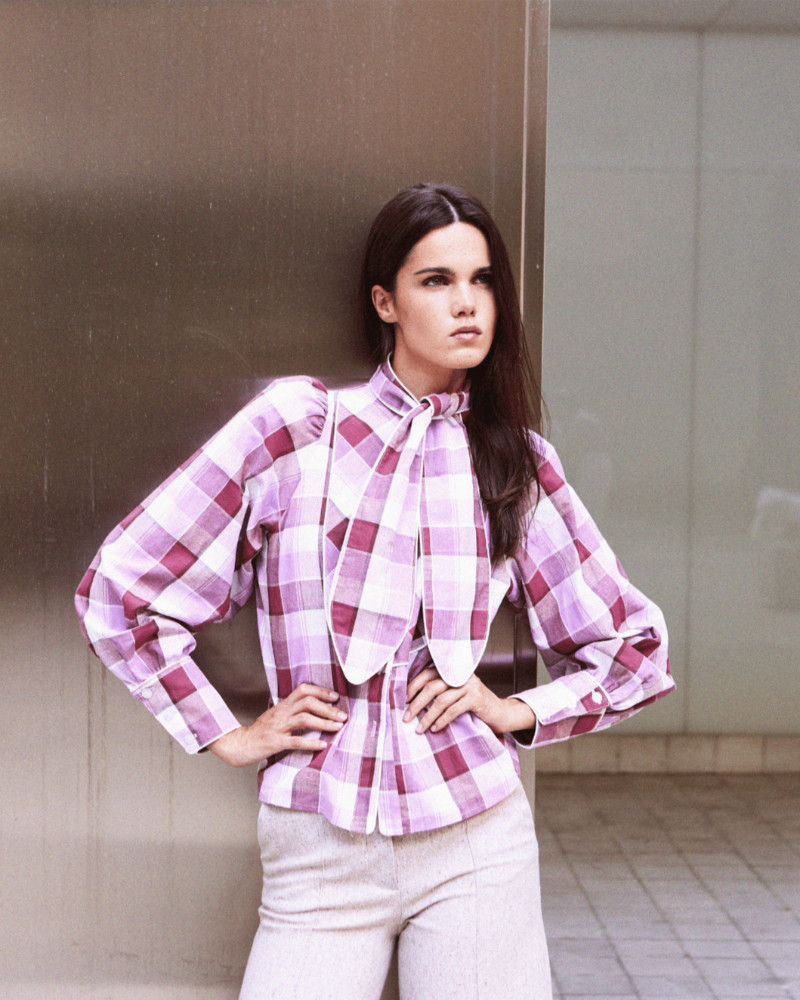 Camisa de cuadros en tonos granate, rosa y blanco con corbata y mangas abullonadas